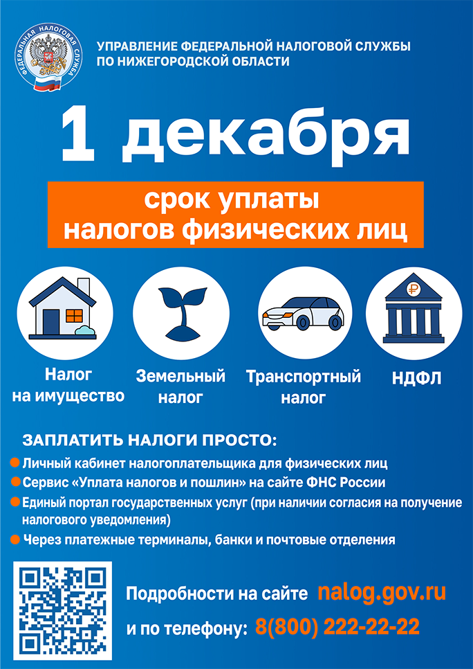 В соответствии с налоговым законодательством в 2025 году срок уплаты физическими лицами имущественных налогов (земельный налог, транспортный налог, налог на имущество) истекает 1 декабря.